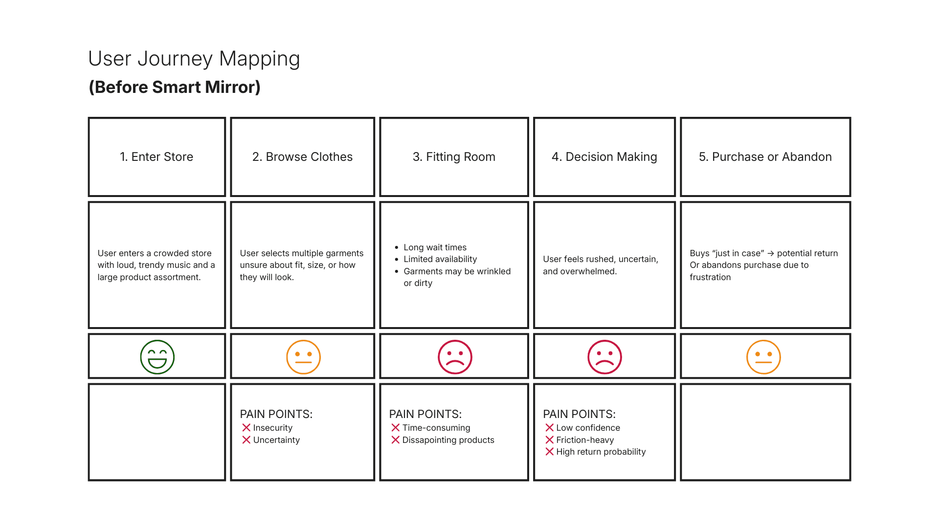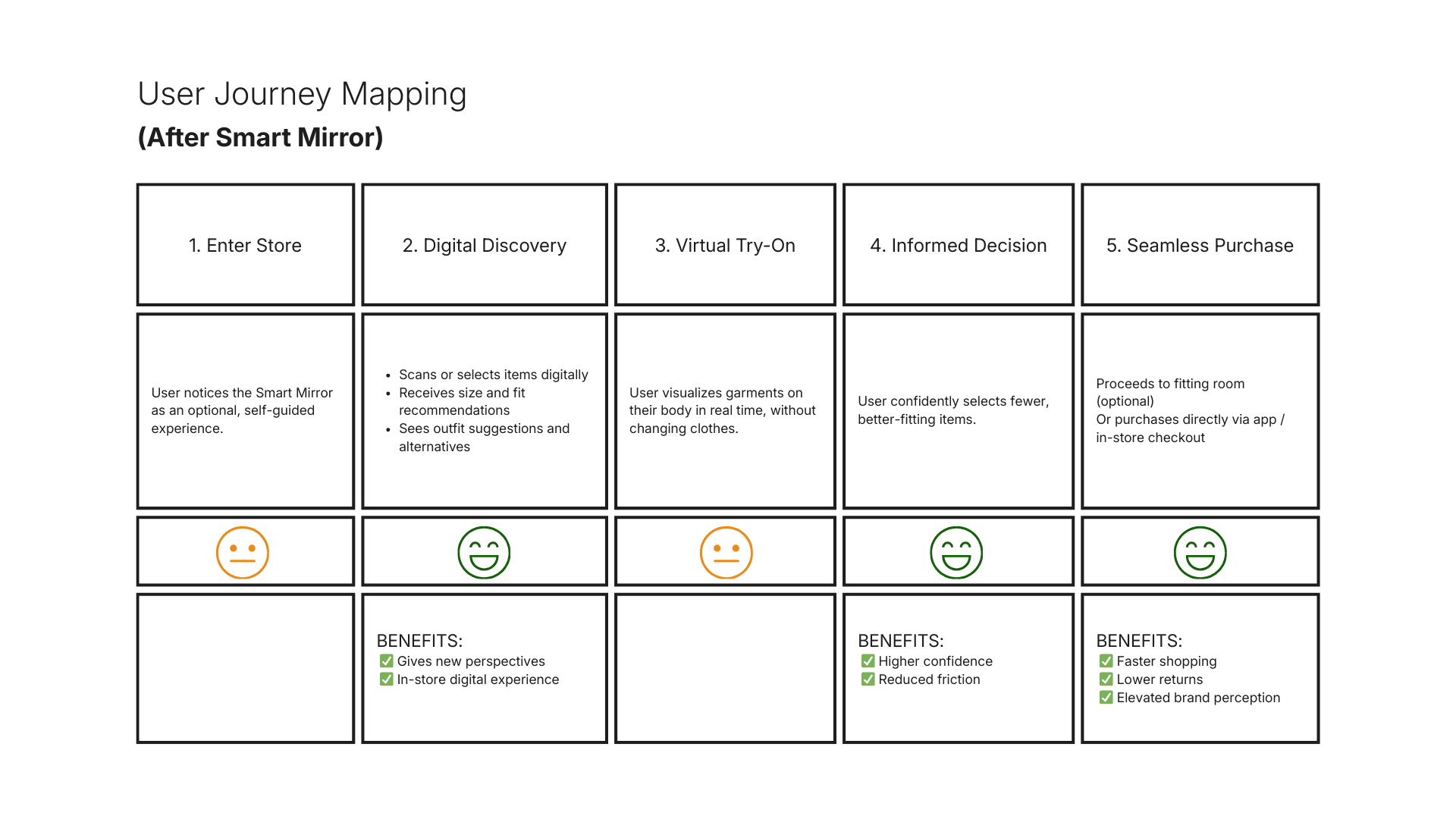 This project explored how physical and digital touchpoints can merge to support intuitive style discovery in retail. Designing a smart mirror pushed my focus beyond UI toward user guidance, decision-making, and emotional connection, reinforcing my interest in UX strategy and experience design.