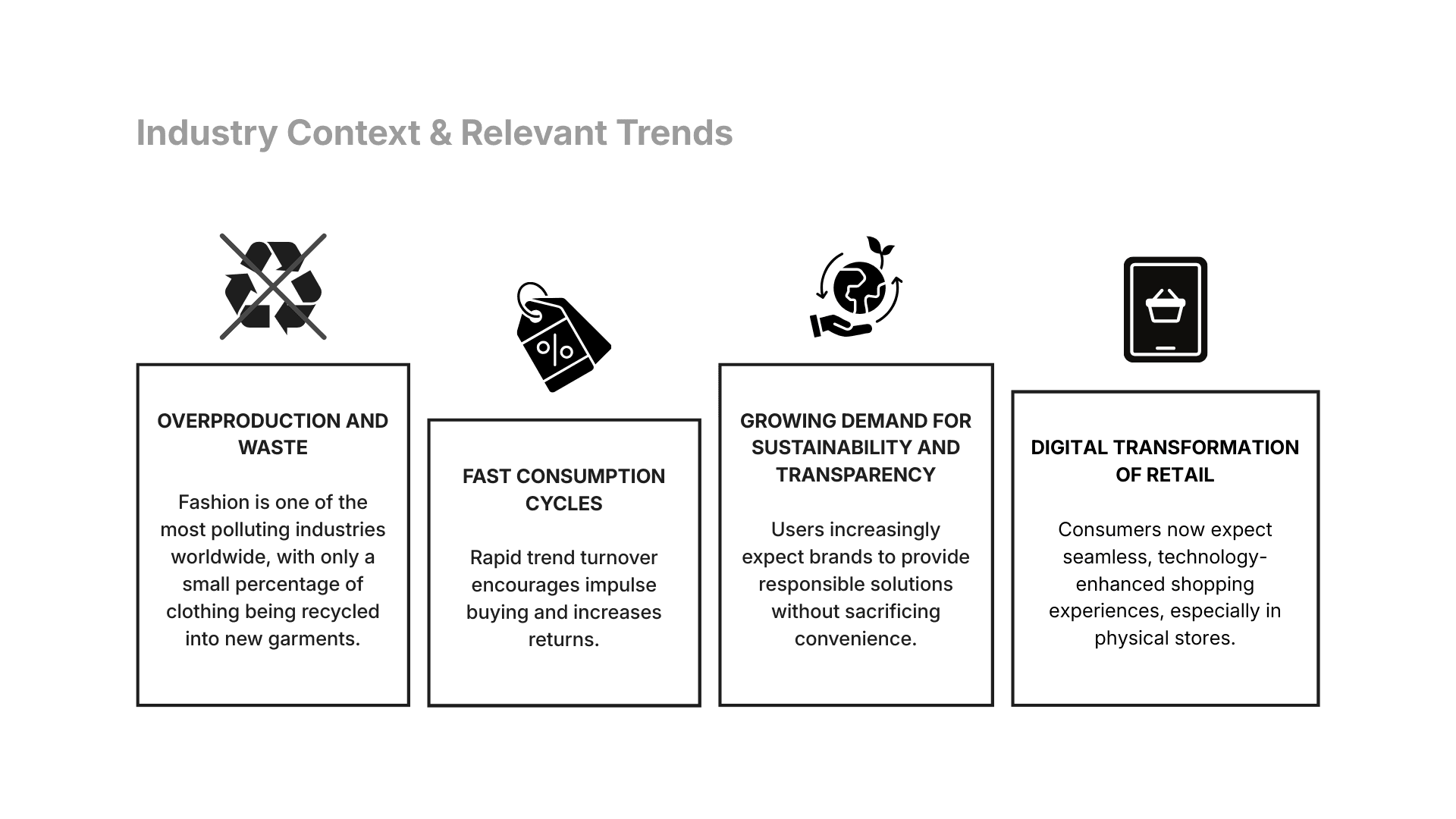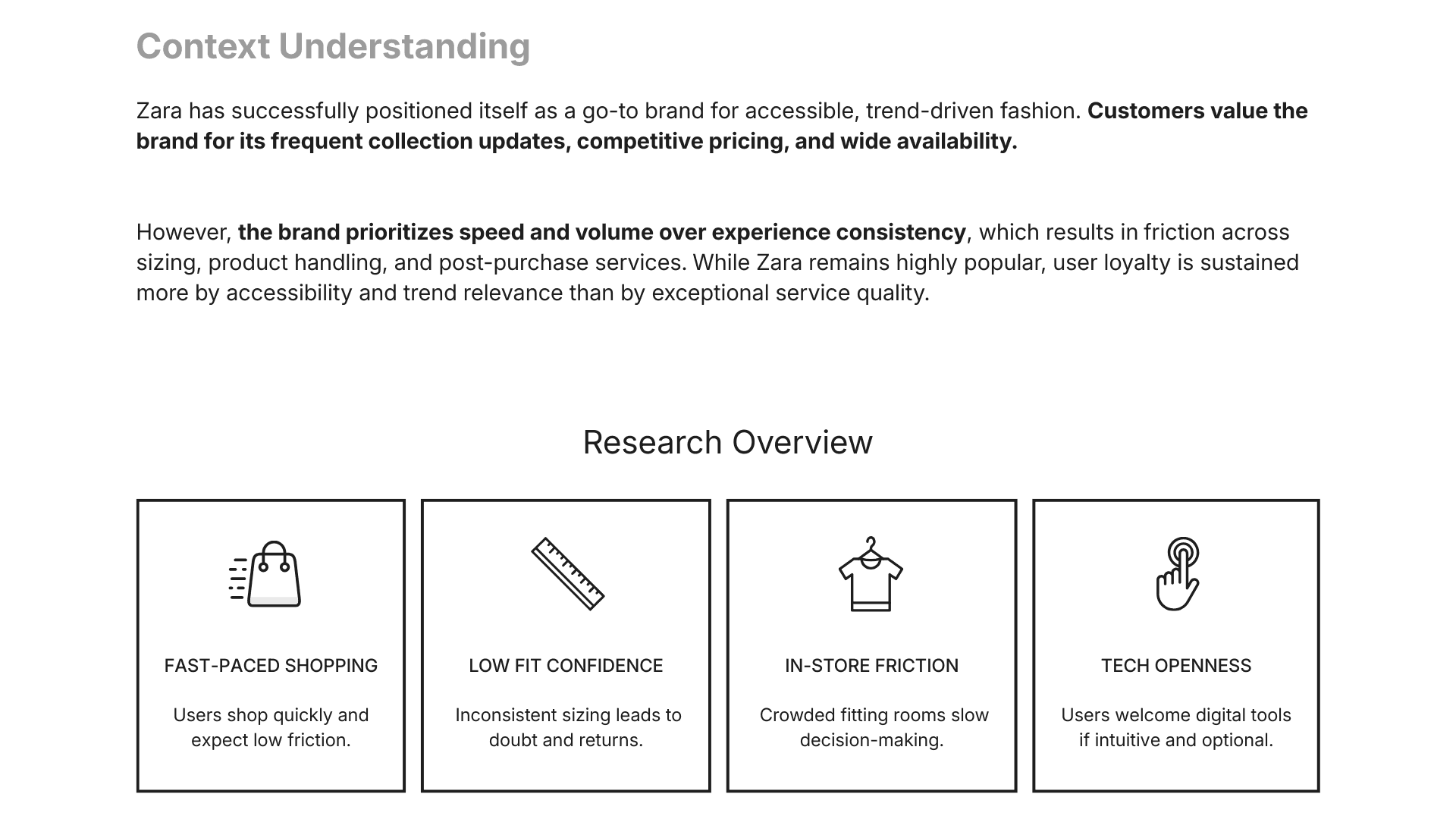 Zara customers enjoy trendy, accessible fashion, but often struggle to make confident purchase decisions in-store due to inconsistent sizing, crowded fitting rooms, poor garment handling, and a fragmented digital experience. These frictions lead to frustration, inefficient shopping journeys, and an increased number of returns, creating a gap between Zara’s innovative brand promise and the actual user experience.