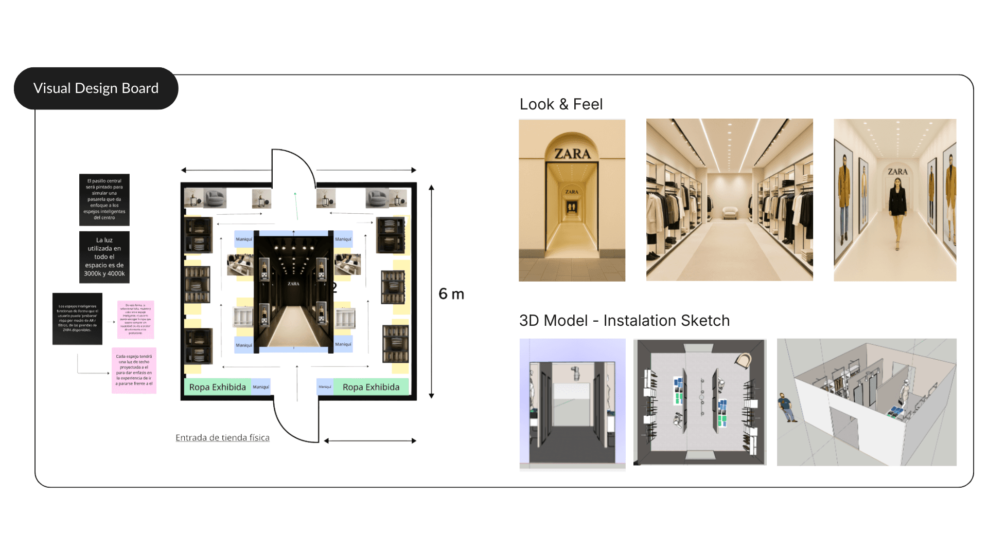 The spatial layout is organized like a runway-inspired pathway, surrounded by shelving, mannequins, and displayed seasonal clothing, encouraging fluid circulation and exploration. The experience is supported by a preliminary sensory map: upbeat, runway-style music (dance pop or electronic), neutral LED lighting with a minimalist atmosphere, Zara’s seasonal fragrance, and tactile interaction through garments and touchscreens. Overall, the concept aims to create an immersive, efficient, and visually engaging shopping experience that blends fashion, technology, and sensory stimulation.