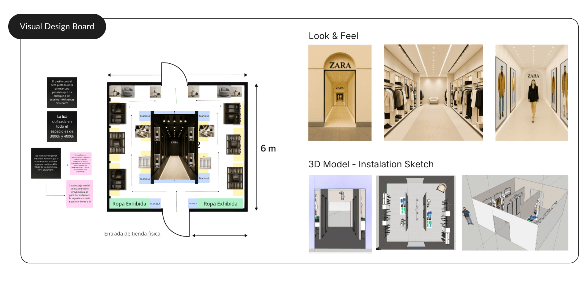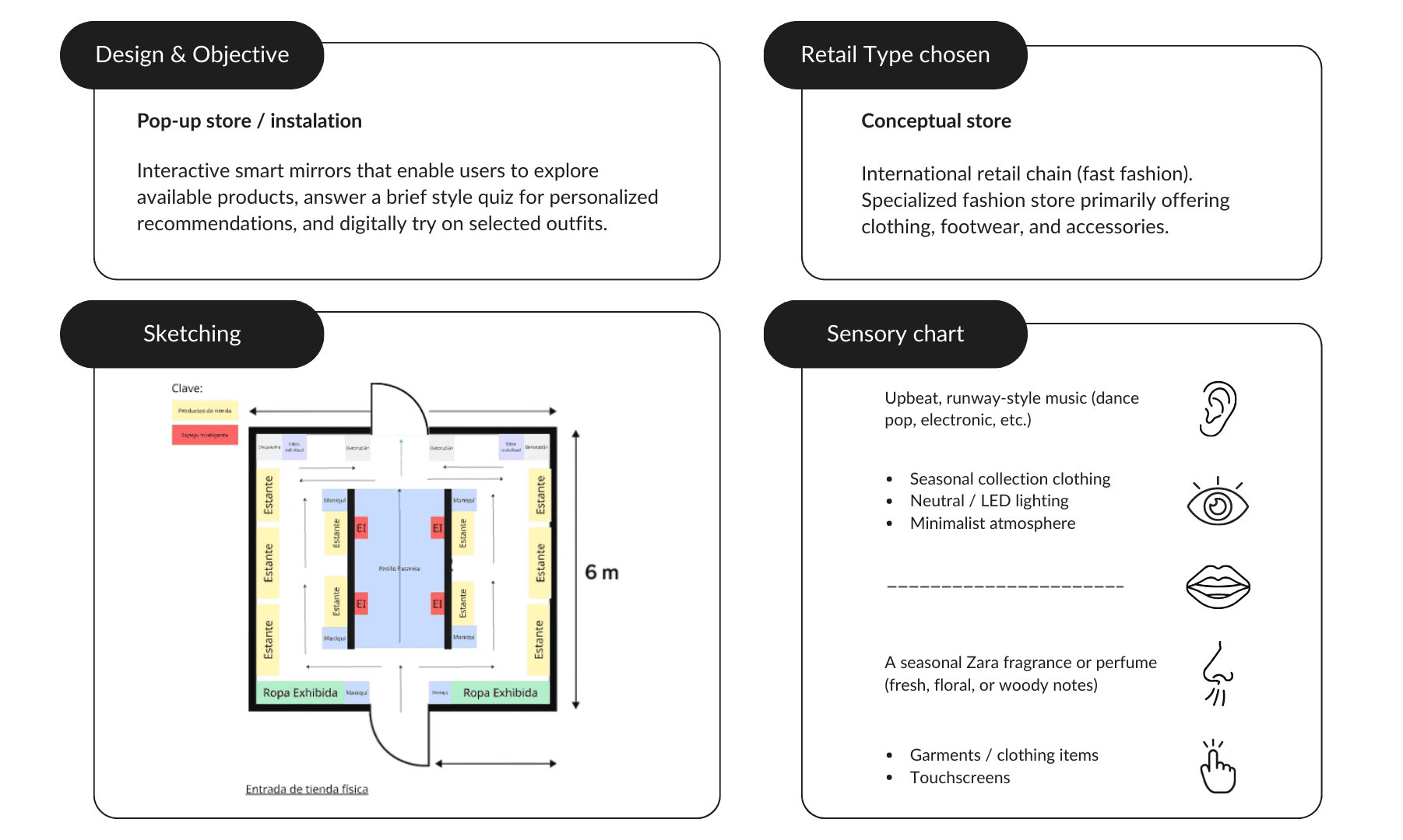 For this project proposal, we made a physical retail experience designed as a conceptual pop-up or temporary installation within the Zara fast-fashion retail context. Inside the store, interactive smart mirrors invite users to answer a short set of questions about their fashion preferences in order to receive personalized suggestions.